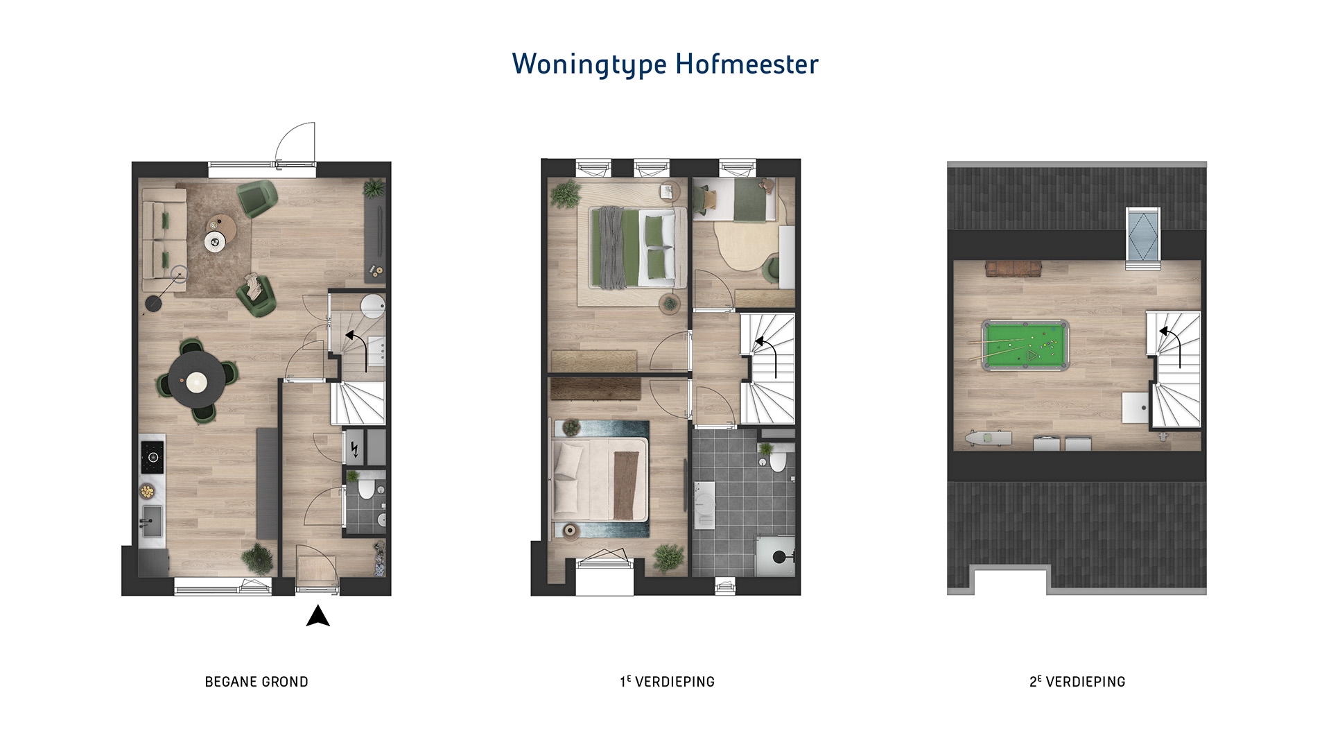 Boven vind je drie ruime slaapkamers. De royale zolder kan je flexibel gebruiken, bijvoorbeeld als werkplek, speelruimte of extra bergruimte. Ook praktisch is alles goed geregeld: je beschikt over twee parkeerplaatsen op eigen terrein, zodat zoeken naar een parkeerplek verleden tijd is, en een berging met mos sedumdak voor fietsen en spullen. Met diverse kopersopties, zoals een uitbouw van 1,2 of 2,4 meter en de keuze voor openslaande deuren of een schuifpui, maak je van woningtype Hofmeester een comfortabel en ruim thuis dat helemaal aansluit bij jouw woonwensen.