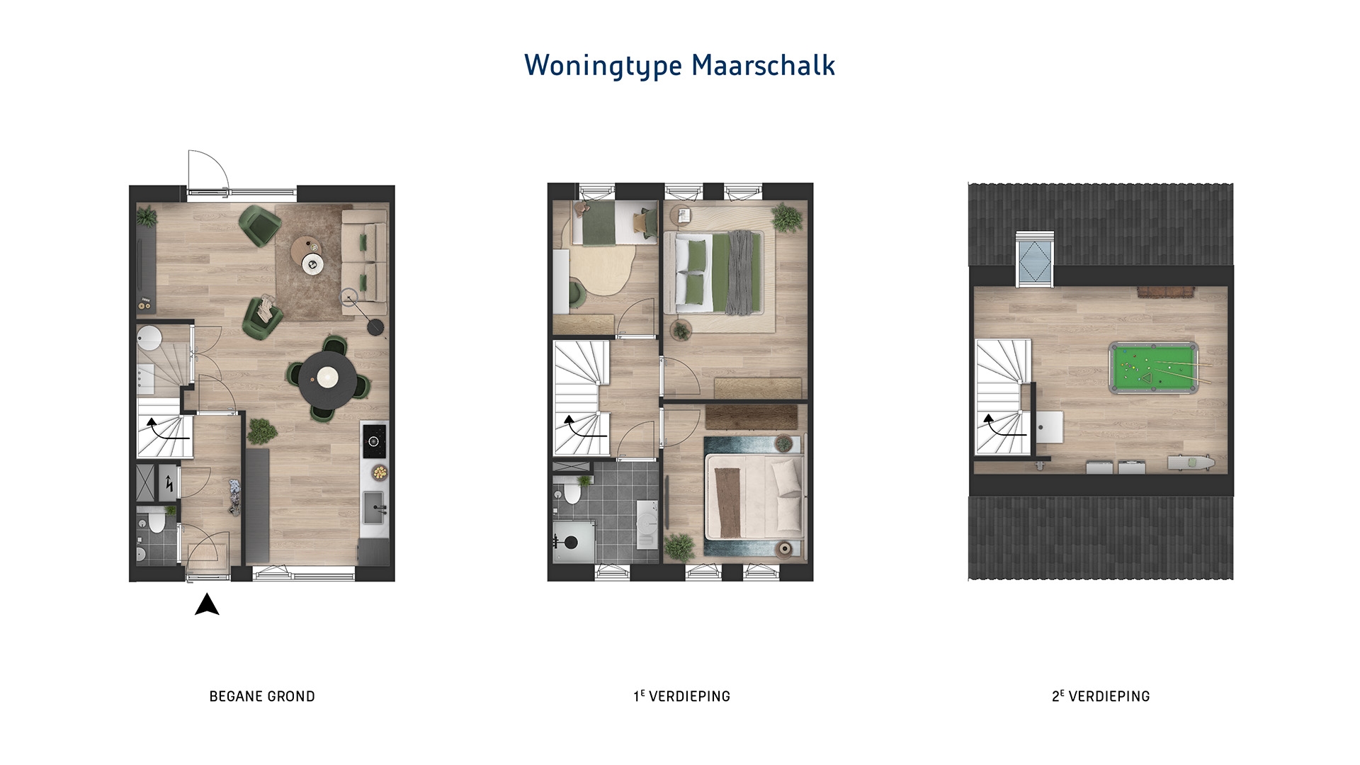 Boven zijn er drie ruime slaapkamers en een royale zolder die je flexibel kunt gebruiken, bijvoorbeeld als werkplek, speelruimte of extra bergruimte. Ook praktisch is alles goed geregeld: je parkeert op twee parkeerplaatsen op eigen terrein, zodat zoeken naar een parkeerplek verleden tijd is Verder is er een berging met mos sedumdak voor fietsen en spullen. Met diverse kopersopties, zoals een uitbouw van 1,2 of 2,4 meter en de keuze voor openslaande deuren of een schuifpui, maak je van woningtype Maarschalk een comfortabele woning die perfect aansluit bij jouw manier van wonen.
